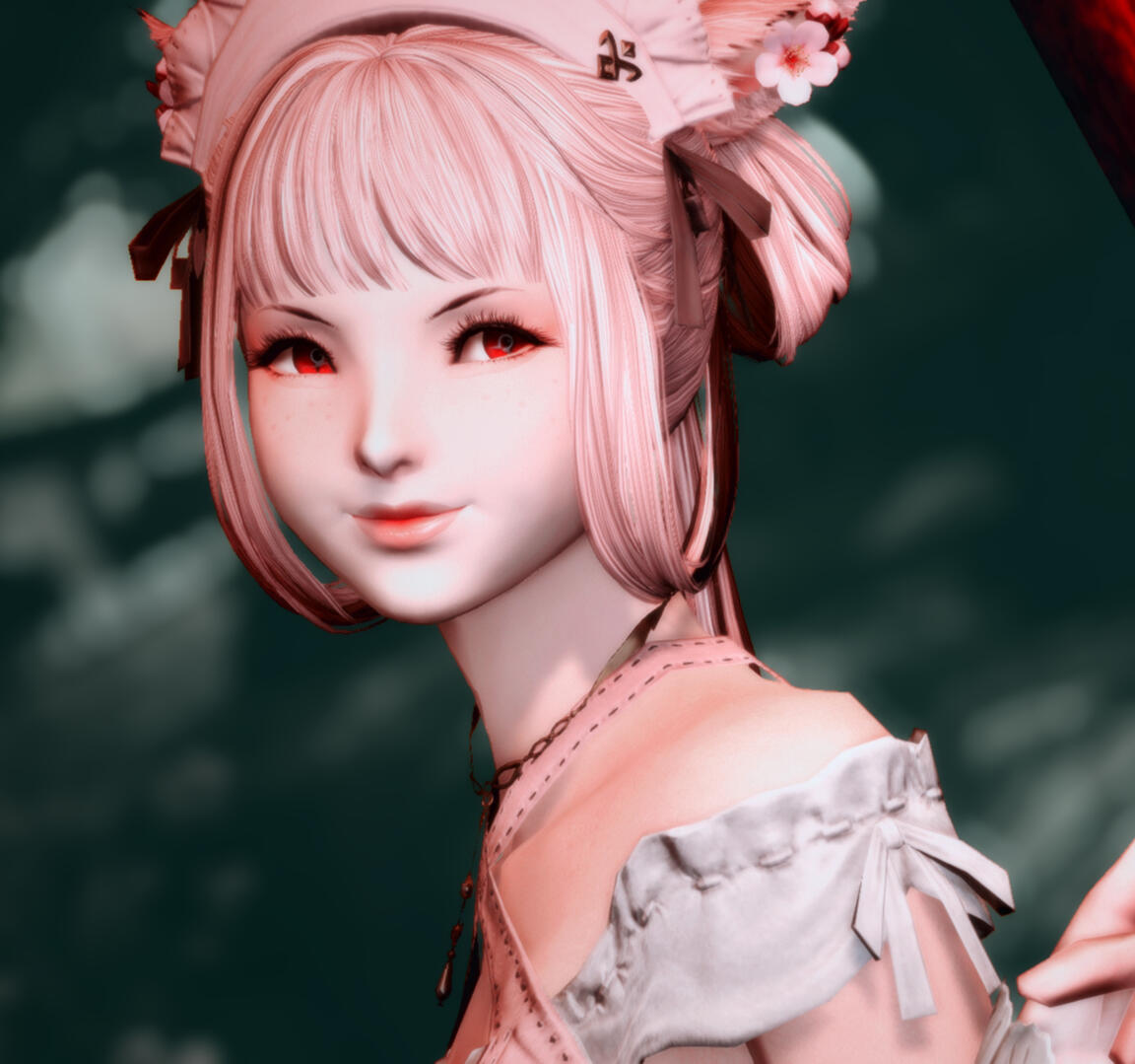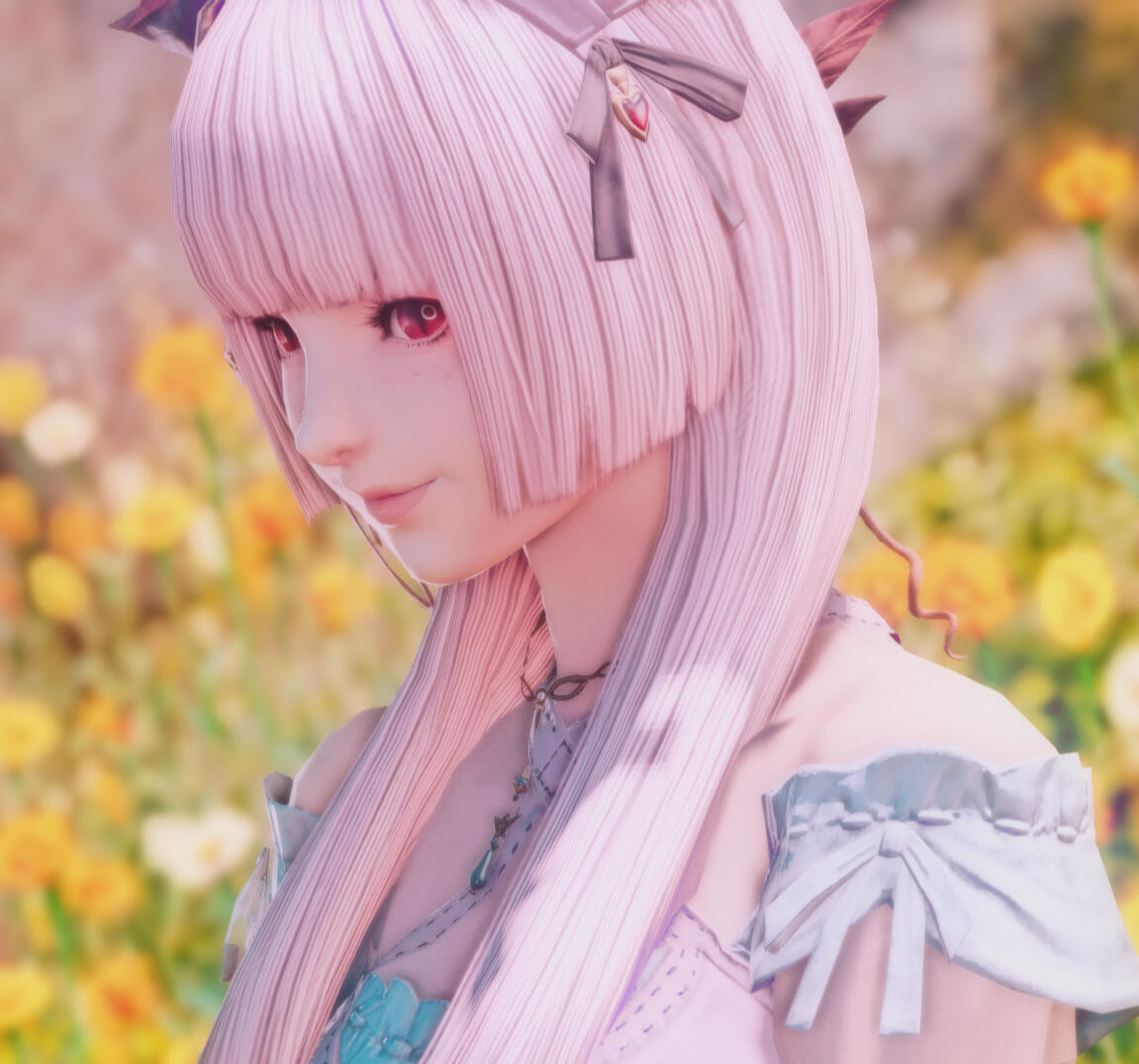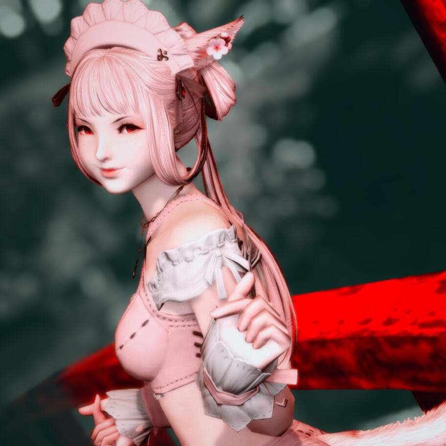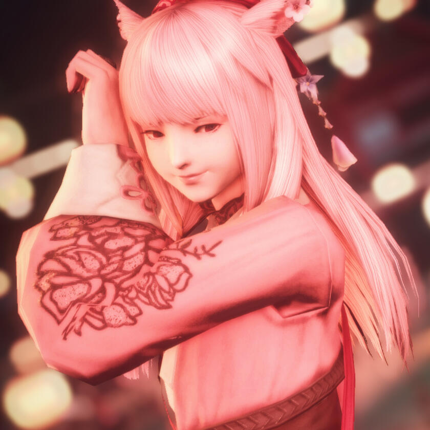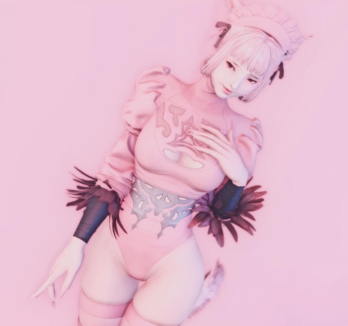 The first thing that most seem to notice is the overwhelming amount of pink emanating off of this Miqo'te. From her head to her toes, she covers herself in the color she believes will make her appear as a friendly being, ready to help anyone in need. Her hair is dyed from its original dark brown and is now a light rose pink. Her ears, which are larger than a normal female her age, are also dyed this color. Her hair appears to be well taken care of although it's been bleached and dyed numerous times.The piercing blood red eyes she owns are also hard to miss. When the sun hits them just right, the most beautiful deep red is visible, accentuating the Seeker traits she possesses.Her makeup is also something of great note. Natsuko compliments her features with soft, rose pink makeup. She applies a pink gloss on her inner lip and doesn't spread it to the outer lip, making them appear to be a more natural color. Her eyeshadow is also a soft pink with a touch of gloss, highlighting the outside of her eyes.Natusko also possesses a passion for fashion, although she is usually monochrome with her pink outfits. Most of the clothing she owns is modest, yet compliments her thin figure. Her favorite outfit consists of a stunning handmade off the shoulder dress, an imported skirt, and custom-tailored kitten heels.