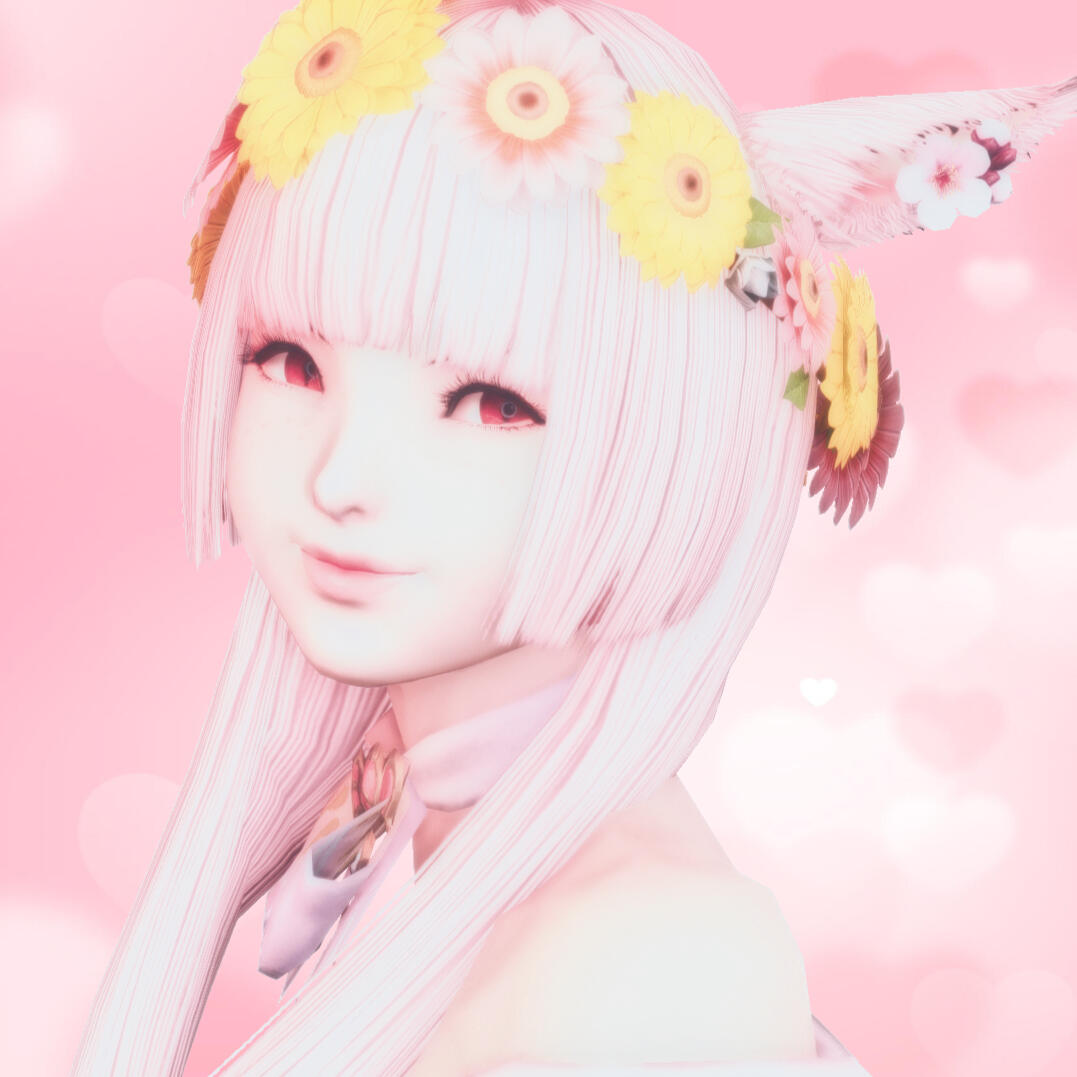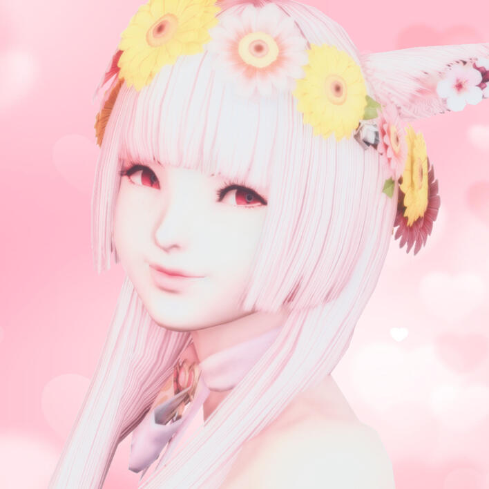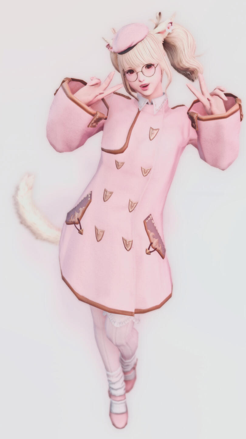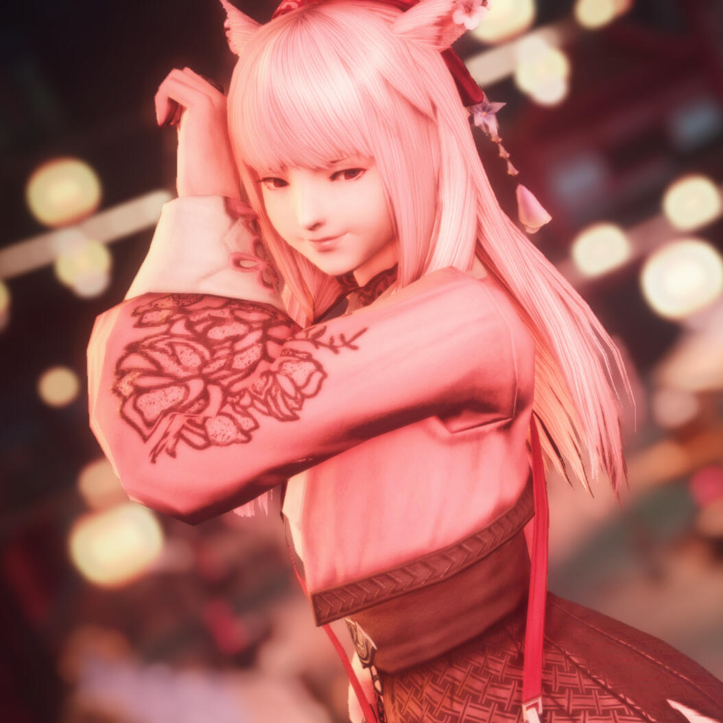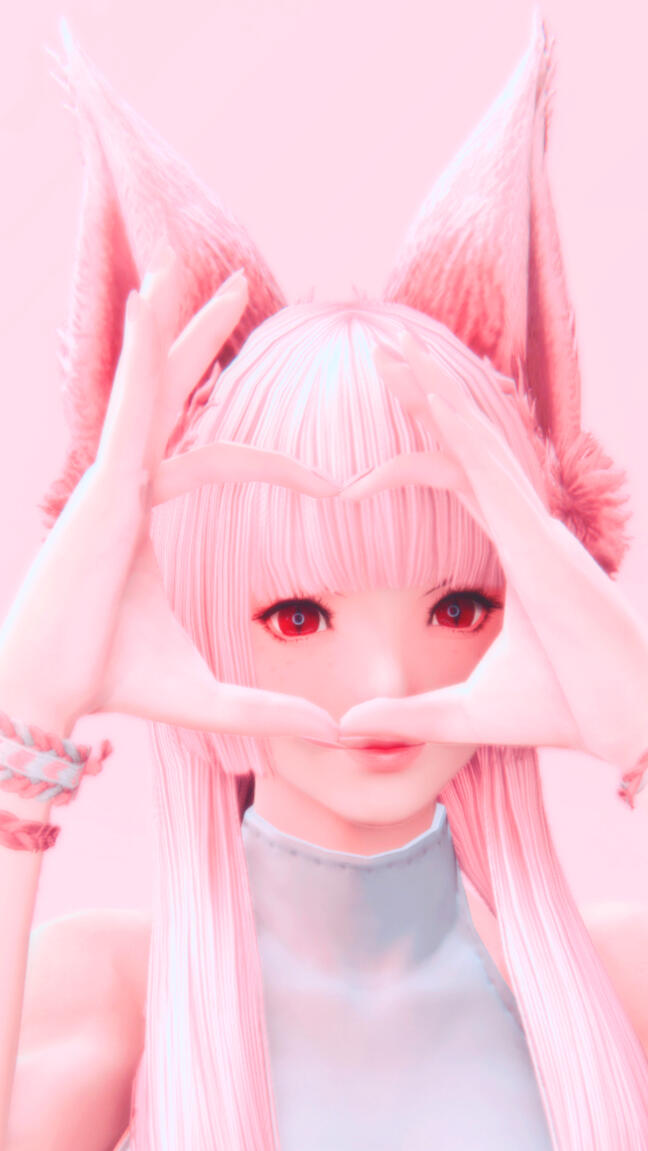 The first thing that most seem to notice is the overwhelming amount of pink emanating off of this Miqo'te. From her head to her toes, she covers herself in the color she believes will make her appear as a friendly being, ready to help anyone in need. Her hair is dyed from its original dark brown and is now a light rose pink. Her ears, which are larger than a normal female her age, are also dyed this color. Her hair appears to be well taken care of although it's been bleached and dyed numerous times.The piercing blood red eyes she owns are also hard to miss. When the sun hits them just right, the most beautiful deep red is visible, accentuating the Seeker traits she possesses.Her makeup is also something of great note. Natsuko compliments her features with soft, rose pink makeup. She applies a pink gloss on her inner lip and doesn't spread it to the outer lip, making them appear to be a more natural color. Her eyeshadow is also a soft pink with a touch of gloss, highlighting the outside of her eyes.Natusko also possesses a passion for fashion, although she is usually monochrome with her pink outfits. Most of the clothing she owns is modest, yet compliments her thin figure. Her favorite outfit consists of a stunning handmade off the shoulder dress, an imported skirt, and custom-tailored kitten heels.